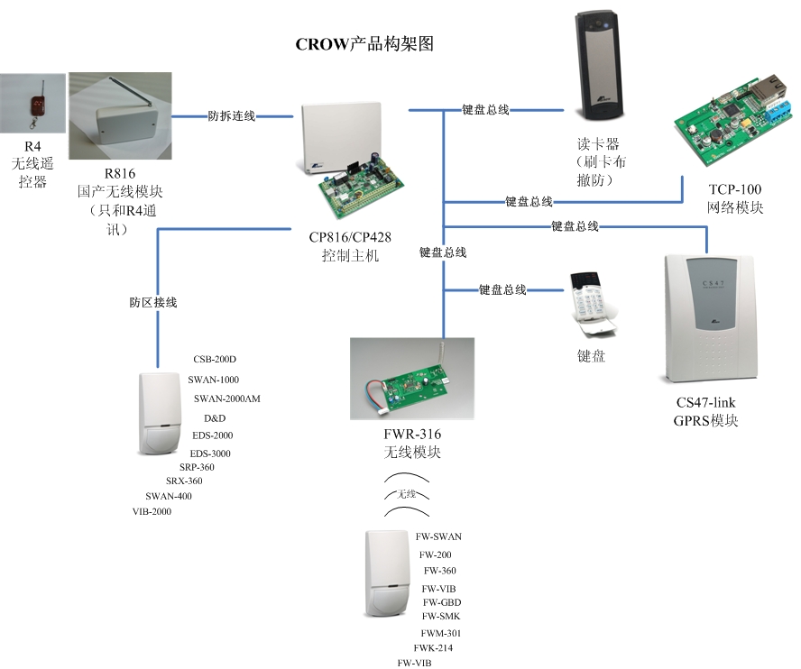 号收发器,最多支持8路(CP-428)及16路(CP-816)无线防区,CW-816已内置无线信号收发器、面板自带LCD液